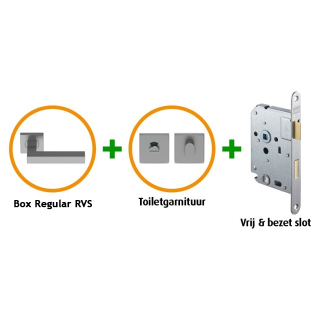 CanDo Binnendeurbeslagpakket Pakket CANHP1106Speciaal ontwikkeld deurbeslag voor CanDo binnendeurenNaast de speciaal ontwikkelde deurbeslag pakketten voor CanDo deuren die een smalslot nodig hebben, bestaan er nu ook pakketten om binnendeuren met een normaal slot te voorzien van mooi deurbeslag.CanDo maakt direct frezingen en boringenCanDo zorgt bij aankoop van dit pakket voor de juiste boringen in de binnendeuren zodat ze kant en klaar zijn om af te hangen. Omdat alle frezingen en boringen al worden gemaakt is het monteren van het deurbeslag een fluitje van een cent.Belangrijke informatieNemef 1200 insteeksloten van dit pakket passen niet op de smalle industriële deurstijlen uit de CanDo Elegant collectie. Industriële deurstijlen zijn slechts 65mm diep waardoor het Nemef 1200 insteekslot met slotkast van 80mm te diep is. Kijk voor deurbeslag pakketten voor industriële deuren naar een CanDo pakket met een smalslot.Deurbeslagpakket CANHP 1106 bestaat uit:+ Nemef 1200 WC-Badkamerslot met RVS voorplaat+ Deurkruk Box 16 RVS (twee zijden) + Toiletgarnituur Box RVS + Geschikt voor stompe en opdekdeuren + Slotgatboring en krukgatfrezing in de nieuwe deur - Pakket CANHP 1106 geschikt voor deuren die géén smalslot nodig hebben Gelijkwaardig pakket met smalslot is CanDo CANHP 302.
