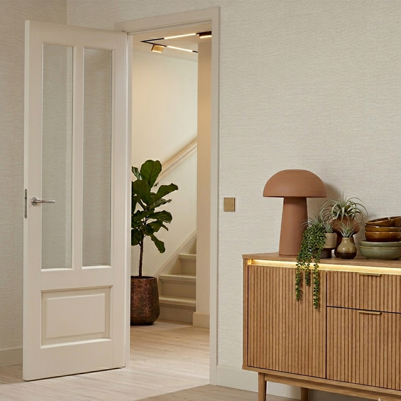 Het schuifdeursysteem kan op en in de wand gemonteerd worden en zijn zeer geschikt voor kleine ruimtes. Het schuifdeursysteem heeft een softstop systeem. De deur wordt direct voorzien van een gleuf aan de onderzijde van de deur voor de vloergeleider en het slotgat kan dichtgemaakt worden met een slotgatstopper. (apart bijbestellen). Een afwerkkoof en schuifdeurkommen zijn los leverbaar en als aanvulling te bestellen.