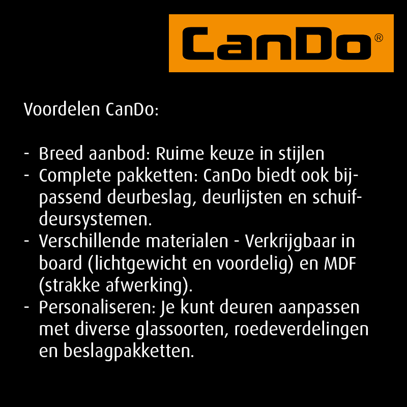 Geef de hoogte en breedte afmetingen in millimeters in. CanDo kan deuren op maat maken met een hoogte tussen de 1800 mm en 2400 mm. En wat betreft de breedte tussen de 630 mm en 1100 mm.