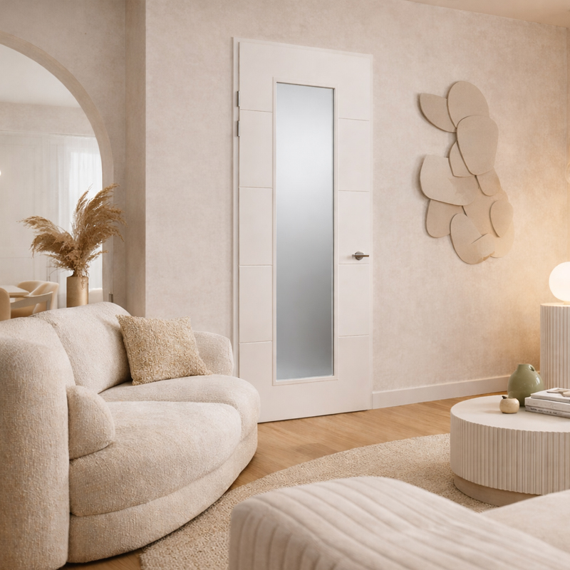 Het schuifdeursysteem kan op en in de wand gemonteerd worden en zijn zeer geschikt voor kleine ruimtes. Het schuifdeursysteem heeft een softstop systeem. De deur wordt direct voorzien van een gleuf aan de onderzijde van de deur voor de vloergeleider en het slotgat kan dichtgemaakt worden met een slotgatstopper. (apart bijbestellen). Een afwerkkoof en schuifdeurkommen zijn los leverbaar en als aanvulling te bestellen.
