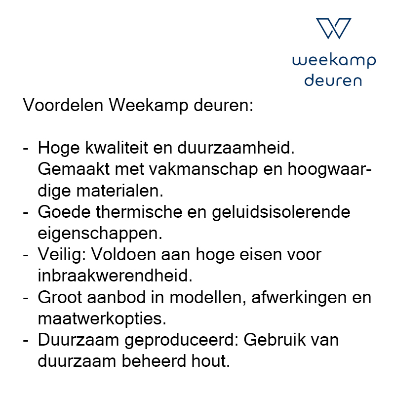Geef de hoogte en breedte afmetingen in millimeters in. Weekamp kan deuren op maat maken met een hoogte tussen de 1650 mm en 2700 mm. En wat betreft de breedte tussen de 530 mm en 1200 mm. Wens je een deur hoger dan 2700 mm neem, dan contact op met onze klantenservice.